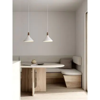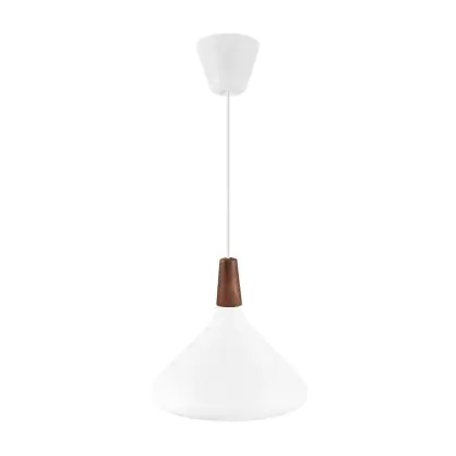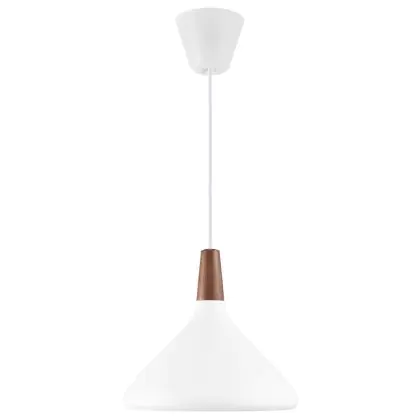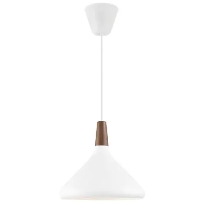 Die Nordlux Pendelleuchte aus der Modellreihe Nori zeichnet sich durch ein modernes Design und einen schicken Materialmix aus. Der Lampenschirm besteht aus Metall. Das Markenzeichen der Modellserie ist die Holzspitze in geöltem Nussbaum. Hinweis: Die Leuchte kommt ohne Leuchtmittel daher - passende E27 LED-Lampen finden Sie jedoch in unserem Shop.