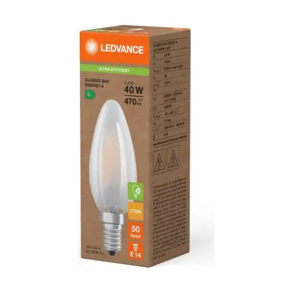 Die Ledvance LED Classic E14 Kerze Fadenlampe Matt 2.2W 470lm - 827 Extra Warmweiß | Ersatz Für 40W ist eine effiziente E14 LED-Lampe mit Retrodesign und der perfekte Ersatz für Ihre konventionellen 40W Lampen mit E14. Zudem strahlt sie Licht in der Farbtemperatur 2700K - Extra Warmweiß aus und punktet durch eine lange Lebensdauer.