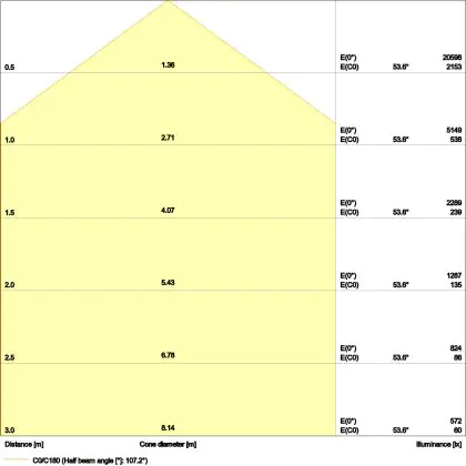 Beispiel: Wird eine Lampe mit einem Abstrahlwinkel von 60 Grad an der Decke (2,5 m Höhe) angebracht, erzeugt sie einen Lichtkegel von 2,9 Metern Durchmesser. Hat die Lampe hingegen einen Abstrahlwinkel von 120 Grad, beträgt der Lichtkegel 8,7 Meter im Durchmesser. |