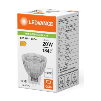 Die Ledvance LED MR11 Gu4 Reflektor 1.8W 184lm 36D - 840 Kaltweiß | Ersatz Für 20W ist eine effiziente GU4 LED-Lampe und der perfekte Ersatz für Ihre konventionelle Halogenlampe mit 20W und einem GU4-Sockel, bei welchem die beiden Stifte einen Abstand von 4 mm zueinander haben. Die Stifte haben einen Abstand von 4 mm. Die Abkürzung MR11 steht für den Reflektordurchmesser von ca. 3,5 cm. Zudem strahlt das Produkt Licht in der Farbtemperatur 4000K - Kaltweiß aus und punktet durch eine lange Lebensdauer.