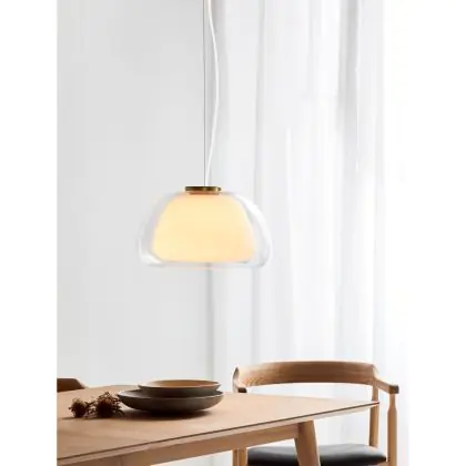 Die Nordlux Jelly Pendelleuchte verbindet minimalistisches, skandinavisches Design mit stilvoller Eleganz. Der doppellagige Glaskorpus mit innerem Opalglas und äußerem Klarglas erzeugt ein weiches, warmes Licht. Die Kombination mit feinen Metallakzenten in Messing sorgt für eine exklusive Optik, die sowohl modern als auch einladend wirkt.