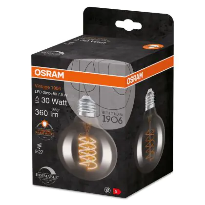 Die Osram Vintage 1906 LED E27 Globe Filament Smokey 80mm 7.8W 360lm - 818 Extra Warm White | Dimmable ist eine effiziente E27 LED-Lampe mit Retrodesign und der perfekte Ersatz für Ihre konventionellen 30W Lampen mit E27. Zudem strahlt sie Licht in der Farbtemperatur 1800K - Extra Warmweiß aus und punktet durch eine lange Lebensdauer.